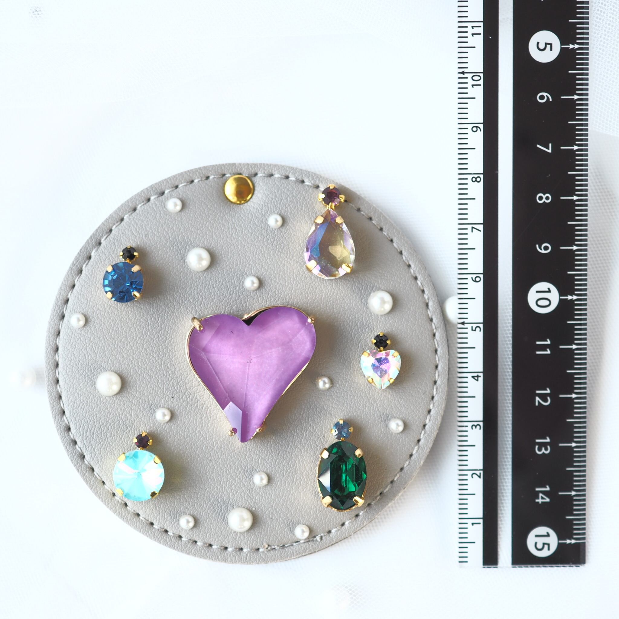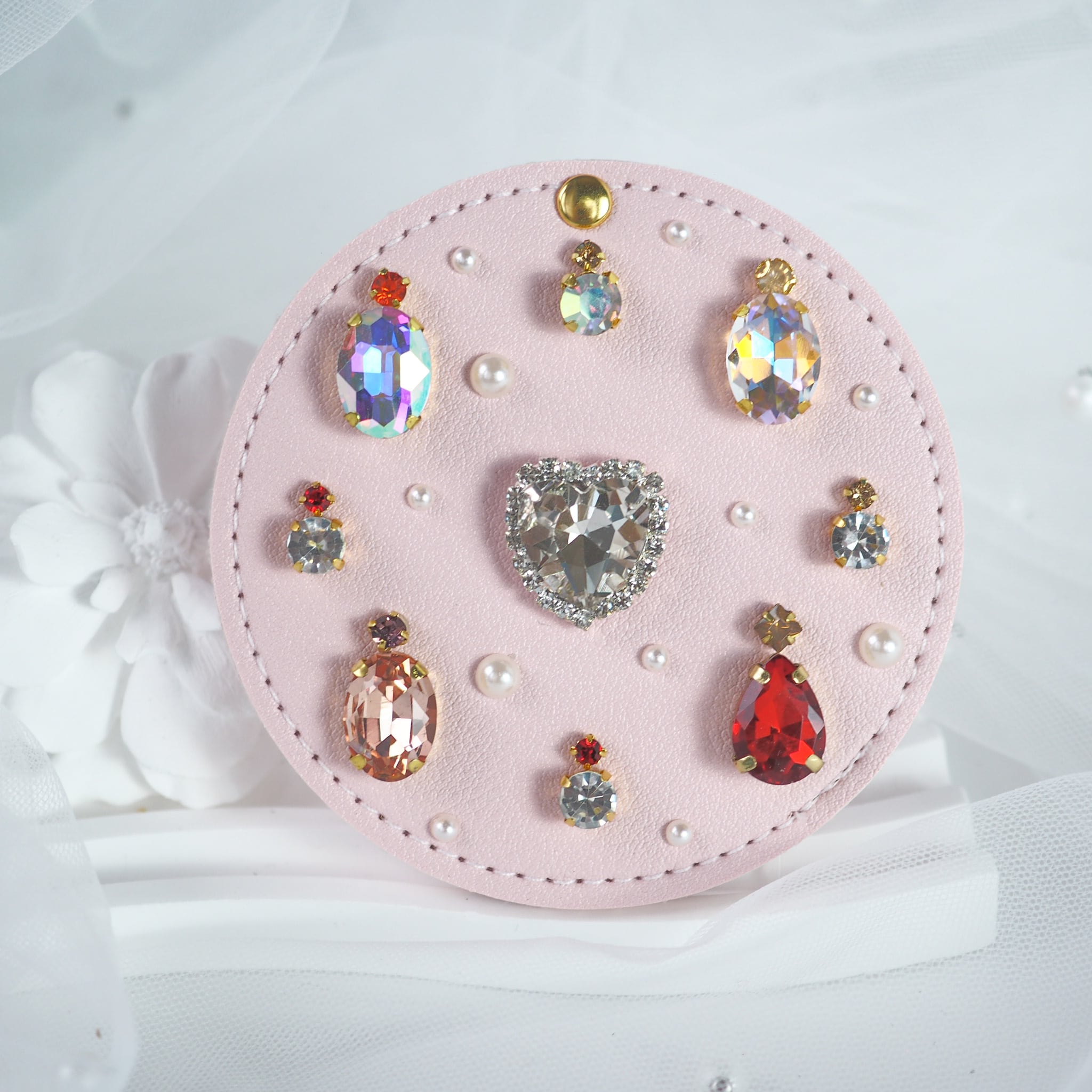 異なるサイズやカラーのビジューを、その時のインスピレーションで一つひとつ手作業で装飾しています。全く同じデザインは二度と生まれないため、あなただけの特別なミラーとして愛用していただけます♡