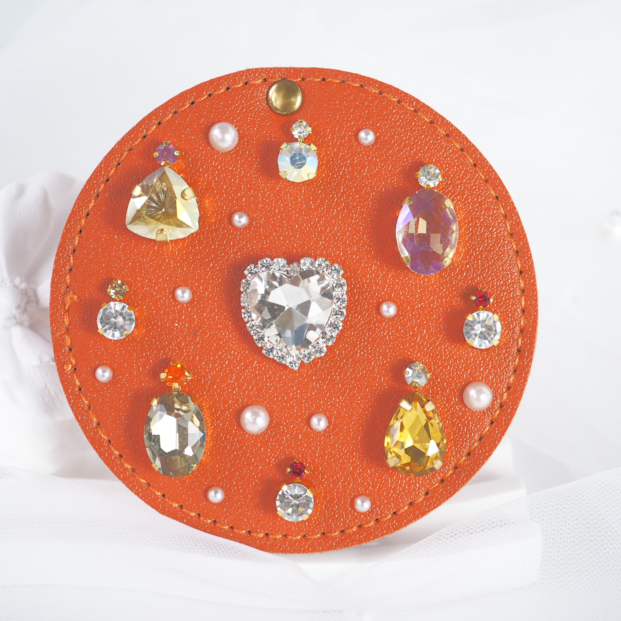 異なるサイズやカラーのビジューを、その時のインスピレーションで一つひとつ手作業で装飾しています。全く同じデザインは二度と生まれないため、あなただけの特別なミラーとして愛用していただけます♡